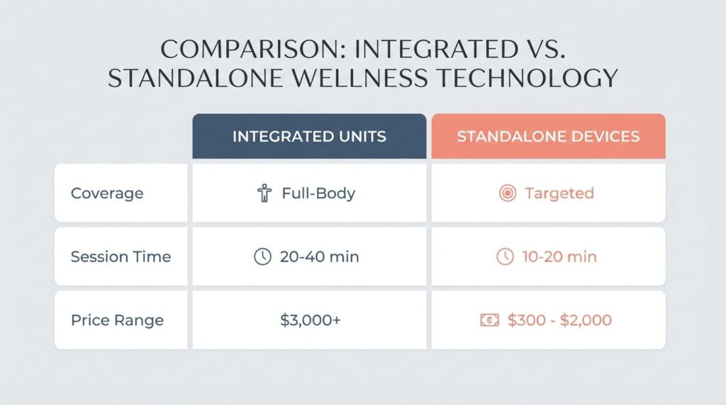 From my own use as a sauna designer since 2014, I find integrated models perfect for deep relaxation days while standalone ones fit better into busy schedules needing quick pick-me-ups.